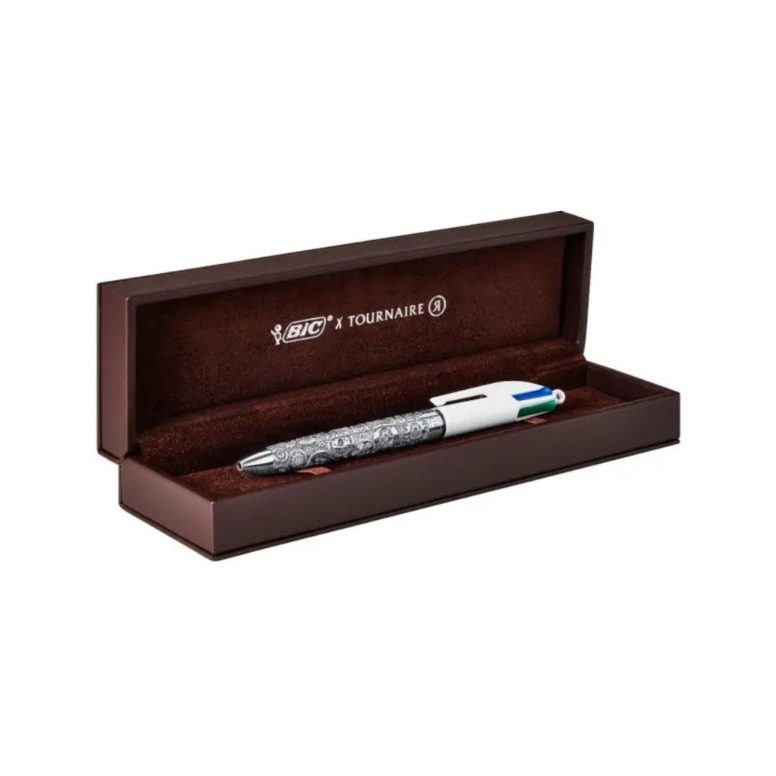 BIC et la Maison Tournaire ont collaboré pour créer une série exclusive de stylos BIC 4 Couleurs, numérotés et limités à 500 exemplaires, façonnés à la main avec l'excellence joaillière de la Maison Tournaire. Le modèle "Engrenages" Blanc en bronze palladié incarne cet emblématique stylo, orné de motifs symboliques de rouages qui représentent l'unité des forces et invitent à apprécier chaque moment.